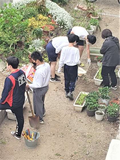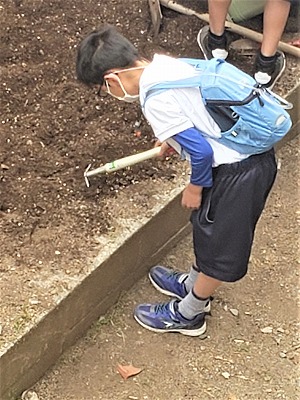 学校菜園 公開日 2022/04/21 更新日 2022/04/21 学校の様子 職員室の隣の畑から 元気な声が聞こえてきます。 3.4組の皆さんが 学校菜園の畑を 丁寧に耕してくれています。 「今年は何ができるのですか」と尋ねると 「きゅうりとオクラ,そして枝豆です」 と笑顔で答えてくれました。 3.4組の皆さんの愛情を受けて 学校菜園の野菜たちは 大きく大きく育つでしょう。 今から楽しみですね。