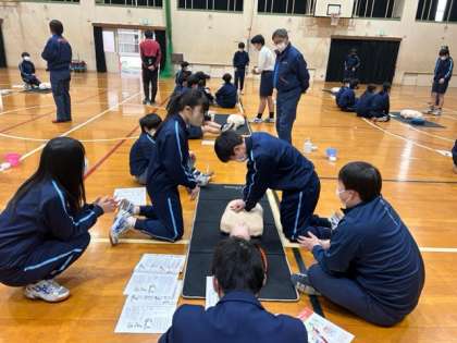 2年生 救命救急 公開日 2023/03/07 更新日 2023/03/07 学校の様子 先週2年生が救命救急の講習を受けました。 毎年2年生の保健体育科で行う実習で、昨年まではコロナの影響で消防署の方が来ていただけなかったのですが、今年は来ていただき、実習ができました。 人形を使い、心肺蘇生の方法を学び、AEDの使い方なども学習しました。生徒たちは、消防署の方が持ってきてくださった「普通救命講習修了証」を受け取っていました。