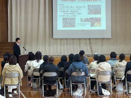 教育課程や学校生活の様子など、スライドを用いて説明していただきました。体育館には制服の見本も置き、紹介させていただきました。