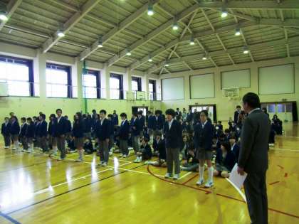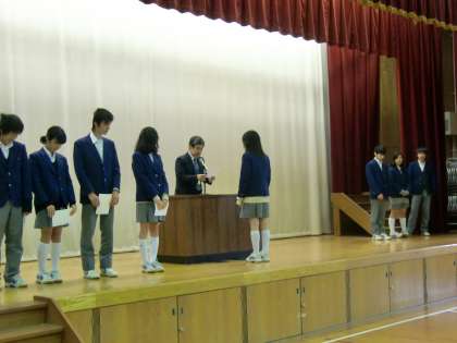 6時間目に前期学級委員の認証式がありました。各クラスから、生徒議員2名、図書委員2名、健康委員2名、美化会員2名の計8名の学級委員が選ばれ、3年1組の8名が代表で校長先生から証書を受け取りました。今日から生徒会活動が始まります。選ばれた48名の学級委員の人たちを中心に、164名全員が一丸となって、我々の烏丸中学校を”からすまいる”のあふれる”いい学校”にしていきましょう。半年間、頑張ってください。