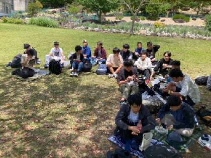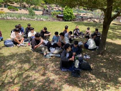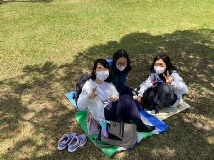 男子は全員で、女子はそれぞれのグループに別れてお昼ごはんです。