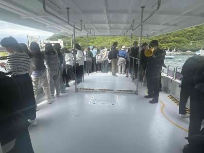ほとんどの生徒がデッキに移り、まじかでうずしおを観ています。