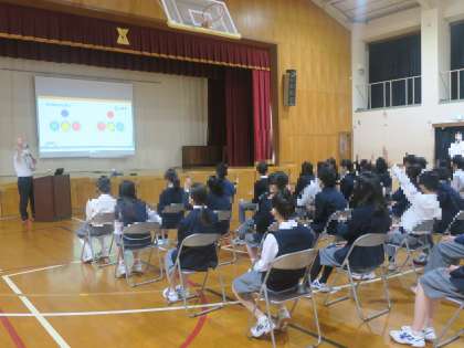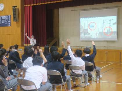 講師の方をお招きして、自転車利用時のルールやマナーを学び、危険性や安全な利用についても教えていただきました。2年生のみなさんは講師の方が質問されたときやクイズのときなどに、しっかりと自分の考えをもって発表していました。今日の自転車安全教室で学んだことや感じたことを大切にして、自分の身体も相手の身体もしっかりと守って自転車に乗っていくことを心がけていってくださいね。