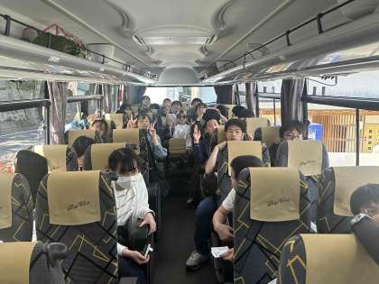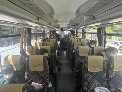 トイレ休憩も終わり、もう少しでラフティング会場に到着します。生徒たちは車酔いの人も少しいますが、元気いっぱいです。