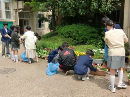今日の昼休みに、3月から玄関前を美しく飾っていたパンジー・ビオラ・チューリップなどを美化委員が整理してくれました。プランターに一杯生えていた雑草を取り除き、花柄を摘むことで、初夏までの元気な姿を保ち続けることができます。また、花が終わったチューりーップの球根を掘り出し、使えるものは来年に咲かせることができます。