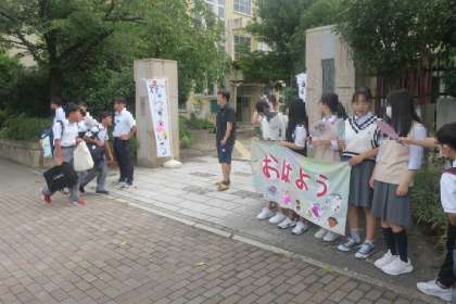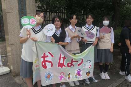 今日からKKP朝のあいさつ運動が始まっています。今朝からも生徒会のみなさんや委員会のみなさん、そして有志のみなさんも参加してくれて、「おはようございます」の輪が広がっています。幼稚園と保育所の園児のみなさんが書いてくださった 「おはよう」の文字とかわいい「絵」が描かれている「うちわ」を作っていただき、生徒はうちわを手にして、園児のみなさんと一緒に行っている気持ちであいさつ運動をしています。