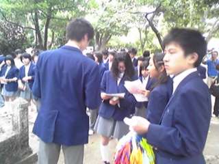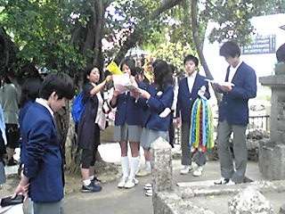 ひめゆりの塔に到着 公開日 2012/05/10 更新日 2012/05/10 3年修学旅行 ひめゆりの塔の前で、京都から持ってきた千羽鶴を供え、学習係を中心に平和セレモニーを行いました。 黙祷。その後、平和祈念資料館を見学しました。