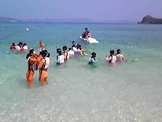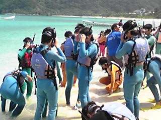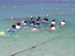 海洋研修ー3 公開日 2012/05/11 更新日 2012/05/11 3年修学旅行 次の種目は、シュノーケルです。初めてのウェットスーツに身を包み、沖縄の熱帯魚を捜しています。素晴らしい透明度です。
