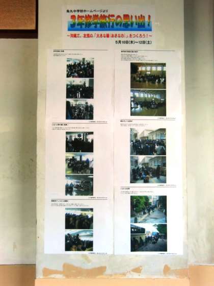 北校舎1階の3年生の教室の廊下に、「3年修学旅行の思い出」コーナーを設置しました。これは、修学旅行中の3日間の烏丸中学校のホームページを印刷したものです。修学旅行に行っていた3年生の生徒は見る機会がなかったのですが、3日間で”1,236アクセス”を記録しました。実に多くの保護者・地域の・学校関係者の方がご覧になったのですね。写真は精密ではありませんが、休み時間にでも見てください。3日間の楽しかった思い出が蘇ると思います。また保護者の皆様も、ご来校の際には、zうぇひご覧ください。