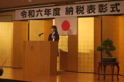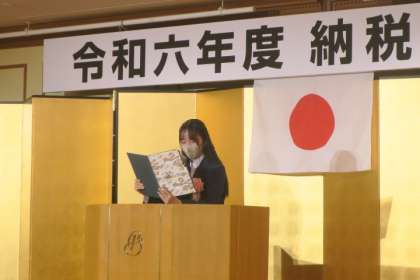 本日行われました「令和6年度 納税表彰式」の中でその作文の朗読をしてくれました。タイトル「山と税」の作文には、幼いころからたくさんの山に登ってきたことに触れながら、森林環境税についてや自然を守ることの大切さについて書かれているものでした。税金について関心をもつ重要さや、山や自然を愛していることを自分の想いを込めて素敵に朗読してくれました。