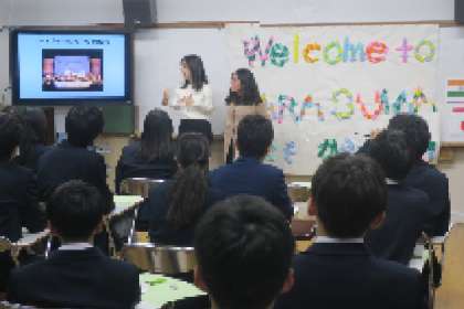 その後は、中学2年生のみなさんから烏丸中学校のことや、日本や京都のことをパワーポイントを使って英語で紹介をしました。どのグループもわかりやすくパワーポイントを作ったり、クイズ形式で楽しんでもらえる工夫を取り入れたグループもあったりと、学校で学んでいる英語を実際に使いながらのプレゼンテーションでした。