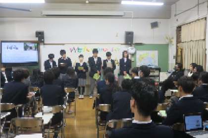 今回の授業でも司会も英語ですすめてくれ、2年生みんなで英語を使いながら、コミュニケーション力や表現力を高めるよい機会となりました。「英語を使いながらいろいろな国の人と知り合うことができること、そして学んでいる英語を失敗を恐れずに勉強していってください」と学生の方が2年生のみなさんにメッセージとしておっしゃっていました。2年生のみなさんには、今日の授業で学んだことをいかして、豊かな国際感覚をさらに身につけていってほしいと思います。