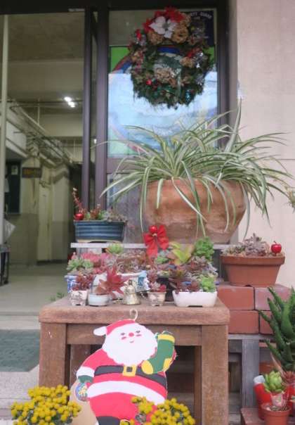 そして、地域の園芸ボランティアの方々に、校内の植物にクリスマスの飾りつけをしていただきました。学校がいつも以上に色鮮やかになり、クリスマスの雰囲気でとても心が弾みます。園芸ボランティアのみなさま、本当にいつもありがとうございます。