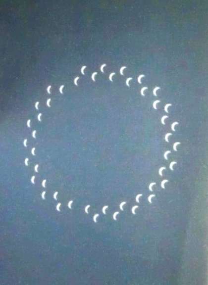 厚紙に小さい穴をいくつも空けて投影すると、太陽の意影がたくさん移り、”日食模様”が見られます。(上の写真)