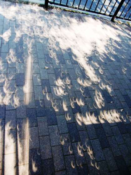 校門の木々の葉の間からもれた光が、無数の欠けた日食像となって地面に移る様子は、とても幻想的です。(中の写真)