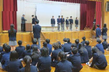 全校の代表として3年1組の生徒が校長先生から認証状をもらいました。