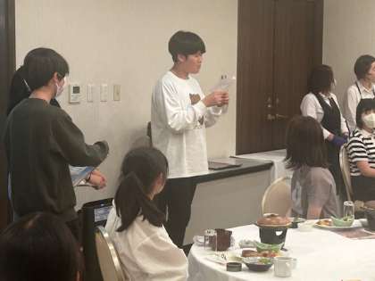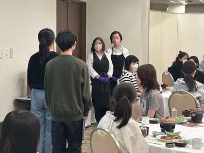 入館式を終え、夕食の時間です。 さすが広島です。お好み焼きが出ています。
