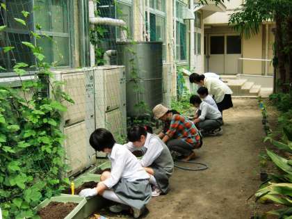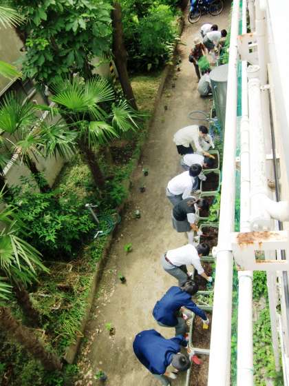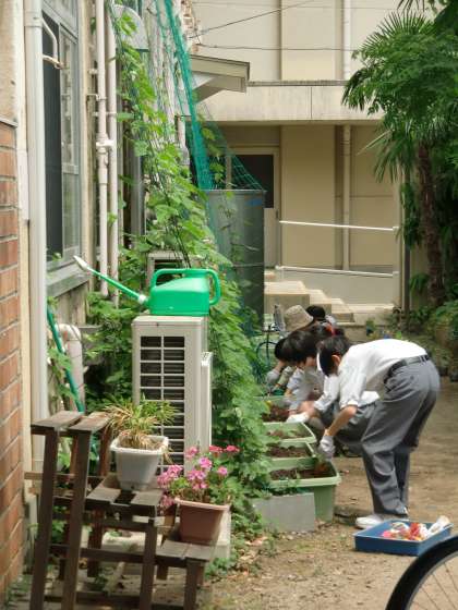 昨日の昼休みに、美化委員が中心となり、緑のカーテン(烏丸グリーンカーテンプロジェクト)をスタートしました。今年も南校舎の南壁面と北校舎の南壁面にゴーヤと朝顔を植え、夏の暑さを少しでも和らげようという”一大プロジェクト”です。すくすくと大きく育ち、”節電”に役だてればいいですね。