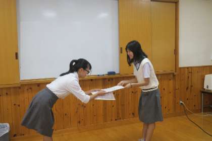 本日、1学期終業式を行いました。まず、生徒議会の授業集中キャンペーンの表彰と、美化委員会の美化強化週間の表彰を、それぞれの委員長のみなさんが行ってくれました。