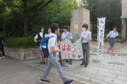 烏丸中・上京中学区の保幼小中で時期を合わせてあいさつ運動を行う取組で、今朝は生徒会執行部のみなさん、そして有志のみなさんも参加してくれて、気持ち良い1日が始まりました。