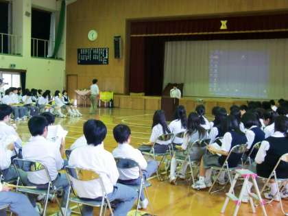 昨日6月7日(木)の5・6時間目に「2012年度 生徒総会」を開催しました。生徒会長からのあいさつに続き、今年の生徒会目標を発表しました。