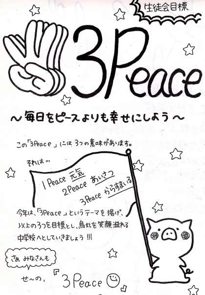 今年の生徒会目標は『3Peace 毎日をピースよりも幸せにしよう〜』です。そして「3Peace」の意味、1Peace=元気、2Peace=あいさつ、 3Peace=からすまいる が説明され、この烏丸中学校を笑顔あふれる素晴らしい中学校へしていこうという呼びかけがなされました。