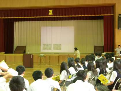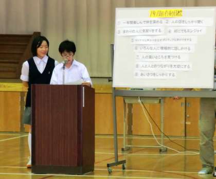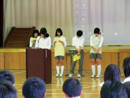 学級目標の発表(その1) 公開日 2012/06/08 更新日 2012/06/08 生徒会 続いて各委員会から、今年度の活動方針が発表されました。生徒会目標に基づき、様々な活動が提案されました。そして、各クラスで話し合った要望事項の返答があったにあと、いよぴよ「学級目標」の発表です。 最初は1年1組、目標は「絆」です。クラスのみんなが仲良くなれるよう、素晴らしいクラス作りをしてほしいと思います。また、学級憲法9条も発表されました。