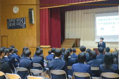 そして、全校生徒のみなさんには本日の発表や交流を通して、今後の総合的な学習の時間においてさらに「探究」へと深めていってほしいと思います。そして、自分達で「どんな烏丸中学校にしたいか」を考え、全校生徒みんなで素敵な烏丸中学校を築きあげていきましょう。