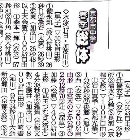一昨日17日(日)に行われた「春季総合体育大会」の水泳の部で、外部で活動している3年生の宮本さんが、女子200m自由形で見事優勝しました。おめでとうございます。烏丸中には水泳部はありませんが、コツコツと練習を積み重ねてきた成果が表れました。夏の大会もがんばってください。