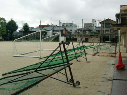 学校では、下の写真のように、生徒が全員下校した後、グランドのサッカーゴールやネットを倒して強風に備えておきました。(強風で倒れたのではありません!)校内の被害もなく、ホッとして言います。