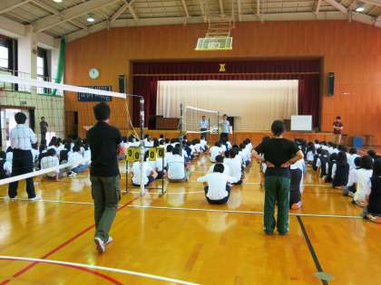 今日の4時間目に、今年度初めての避難訓練を実施しました。朝から小雨が降っていたため、避難場所をグランドから体育館に変更して行いました。