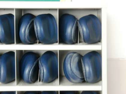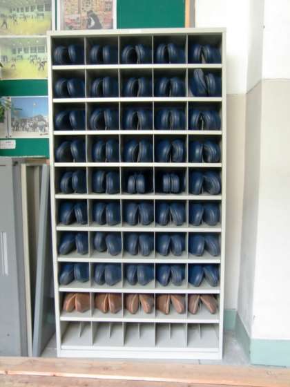 最初は、南校舎2階の会議室前の「スリッパ入れ」です。とても行儀よく、スリッパが整列しています。狭いスペースに、50足ものスリッパを収納できる”優れ物”です。底を合わせることで、スリッパの乾燥や清潔感もあります。どこにでもありそうですが、用事で来られた教育委員会の方も珍しがっておられました。