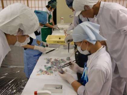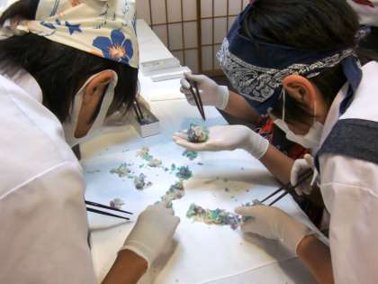 3階では和菓子作りの最中です。今日のお菓子は彩の素晴らしい「あじさい」です。まさに今の季節にピッタリです。中心の黒餡の周りに、アジサイのように色とりどりの”花びら”をくっつけていきます。味は同じはずですが、見た目はバラバラ・・・。繊細さが求められる作業です。