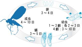 畑、植木鉢等)に産卵し、幼虫・蛹を経て、20日程度で成虫に