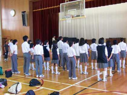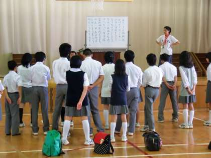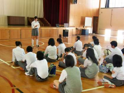 最初に、参加者27名全員が体育館に集合し、「はじめの会」を行いました。校長先生と生徒会長のあいさつの後、校歌の斉唱と「ほらね、」を練習しました。様々な機会に校歌を歌ってはいるのですが、なかなか大きい声で自信を持って歌えない人が多いようです。校歌は烏丸中学校の”顔”です。堂々とした態度で、自信と誇りを持って歌ってください!