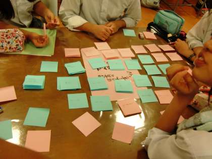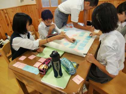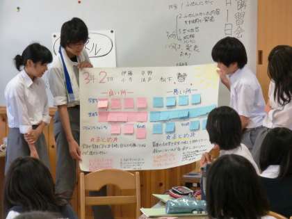 学年ごとの5つのグループに分かれ、良い所は赤色、悪い所は青色の付箋紙にどんどん記入します。そしてその付箋紙を集め、内容別に分類して摸造紙にまとめます。そうすることで、現在の課題が浮き彫りになり、それを克服する方法が浮かび上がってきます。時間をオーバーしましたが、烏丸中の課題がまとまってきました。挨拶の声が小さい、校歌を大きい声で歌えない、積極性が足りず待ちの姿勢である、ルールが守れないとき指摘できない・・・それらを集約すると