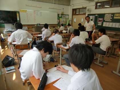 8月になっても暑い毎日が続いています。リーダー講習会も終わり、今日から3年生の学習会が再開しています。今日は朝9時から2教室に分かれ、22名の生徒の皆さんが、課題プリントをしたり、基礎練習をしたり、質問したり・・・それぞれの課題克服を目指して勉強に取り組んでいます。教室はエアコンが効いているので、学習環境としてはまずまずですが、一歩廊下に出ると!校舎の外へ出ると!!すごい暑さです。