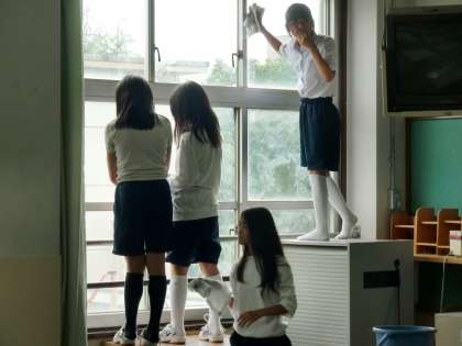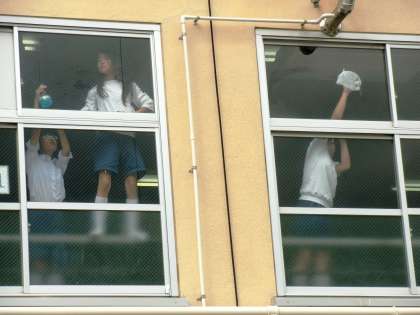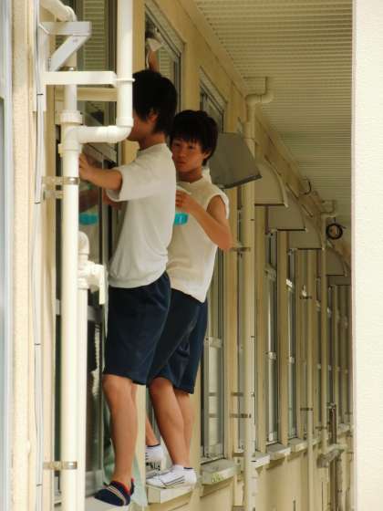 全校一斉美化活動の様子・・・教室の窓ふき 公開日 2012/08/29 更新日 2012/08/29 学校の様子 教室の窓ガラスも、上の方はなかなか掃除ができません。今日は窓の桟に上り、高い所を中心に磨きあげました。気持ちいいですね・・・!