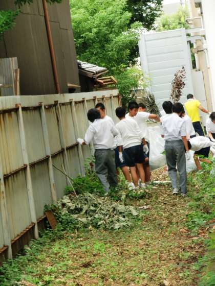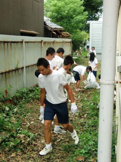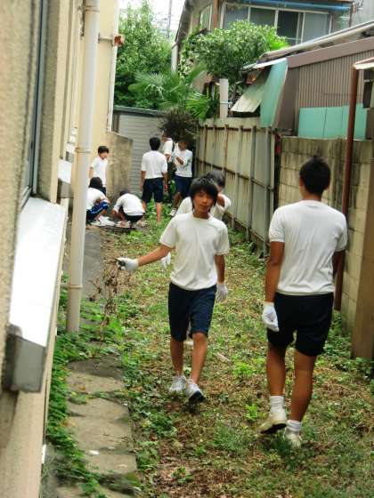 もっともすごい状態になっているのが、北校舎裏です。雑草が覆い繁り、足の踏み場もありません。ごみもたくさん散らかっています。こんな機会でないと掃除をしない場所ですから、当然でしょうね。虫に刺されながらたくさんの雑草を抜き、何とか作業を進めました。お疲れ様でした。