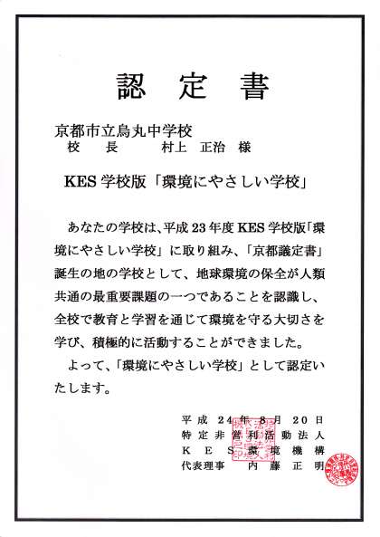 前回に続き、烏丸中学校がKES学校版「環境にやさしい学校」に認定され、認定書が届きました。これは、昨年平成23年度に「環境にやさしい学校」の申請をしていたものが、「NPO法人KES環境機構」による書類審査・実地審査を通して認定を受けたものです。この認定結果は、学校として日々の教育活動を通して、未来を担う子どもたちの環境問題への理解を深め、環境改善に向けた取組を実践していることを評価していただいたものだと思います。
