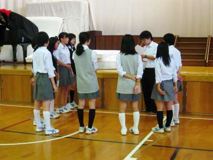 今日の午後、合唱の指導に、同志社グリークラブの皆さんに来校していただきました。”グリークラブ”は男性合唱団です。高音から低音まで、男性ならではの素晴らしい声で素敵な合唱を聞かせていただいています。烏丸中では19日に合唱コンクールを行いますが、それへ向けて、現役の大学生の皆さんに直接指導していただく機会をもっていただきました。パート指導、全体指導とてきぱきと教えていただき、これからの仕上の合唱の参考にさせていただきました。自分たちの合唱に、少し奥行と幅が出てきたように思えます。あと1週間あまり、さらに練習を積み重ねて、当日寒梅館ハーディーホールにその成果を披露したいと思います。暑い中、有難うございました。
