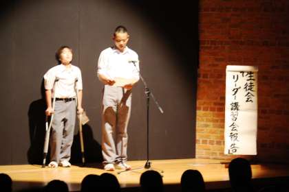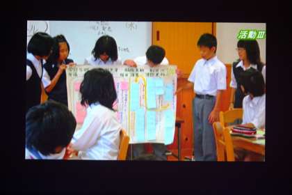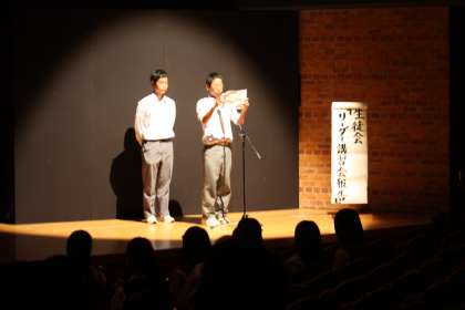 最初は、8月1日に行われた「生徒会リーダー講習会」の報告です。27名の代表が参加し、烏丸中をもっともっと良い学校にするために行った話し合いや取り組みの様子を報告しました。歌の練習、ディべート、教室のドアのペンキ塗り、垂れ幕作り、グループでの話し合いと発表など、当日の様子を伝えてくれました。参加した人はもちろん、参加しないかった人こそ中心となり、「烏丸中を良い学校にするには・・・」をこれから皆でしっかりと考えていきましょう。