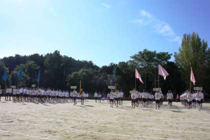 体育祭−1(開会式) 公開日 2012/10/02 更新日 2012/10/02 学校の様子 絶好の体育祭日和の下、午前9時より体育祭が始まりました。最初は開会式です。全校生徒の入場行進の後、挨拶、生徒会旗掲揚、選手宣誓、準備運動があり、いよいよ競技が始まります。