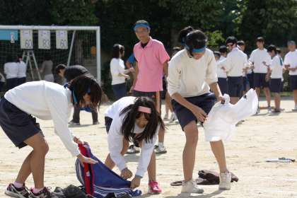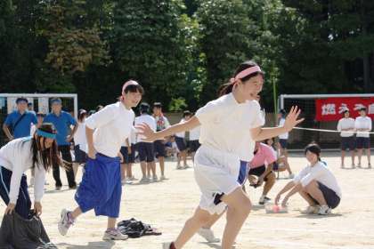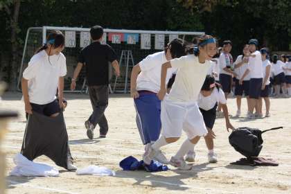 体育祭−3(女子仮装競走) 公開日 2012/10/02 更新日 2012/10/02 学校の様子 女子の仮装競争が始まりました。スタートして、「はくもの」⇒「はおるもの」⇒「かぶるもの」の順に身につけます。だぶだぶズボンにトレーナー、ちょんまげ・・・とてもユニークなファッションが出来上がりました。