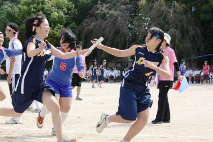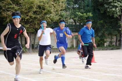 午後の競技が始まりました。最初はクラブ対抗リレーです。運動部にとっては、他のクラブには絶対に負けられない勝負です。昼休みからユニフォームに着替え、バトンの練習などをしているクラブも・・・。