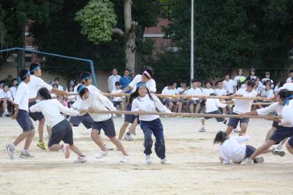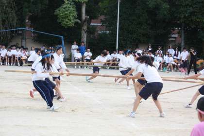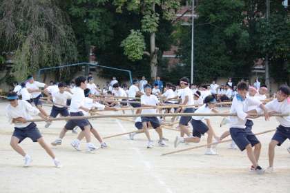 2年生の団体競技は棒引きです。それぞれの陣地から一斉にスタートし、中央の13本の竹棒をそれぞれの陣地へできるだけ多く持ち込みます。男子、女子、全員と3回勝負で、持ち込んだ竹棒の合計数で勝敗を競います。