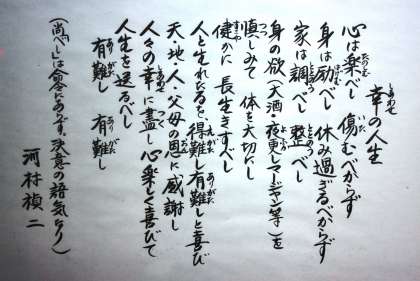 この書の作者は河村禎二さんです。河村さんは、観世流能楽師で河村能舞台当主でしたが、心不全のため京都市上京区の病院で2010年3月18日に86歳で亡くなられました。1923年に京都市で生まれ、4歳のときに初舞台。1956年に自宅にあの「河村能舞台」を設立されました。重要無形文化財の保持者(総合認定)です。 ご自身が幸せな人生の生き方を身をもって示されたようですね。