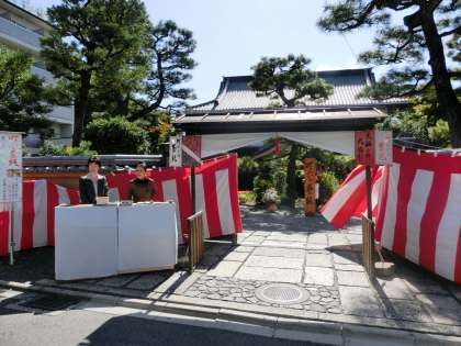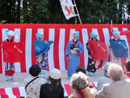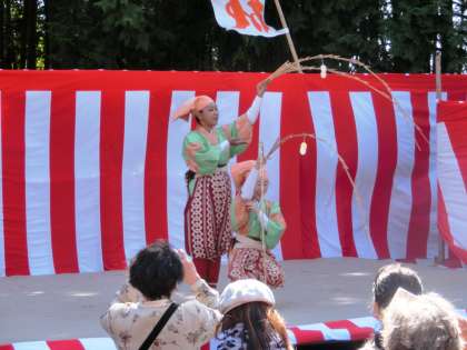 昼前からグランド東側から笛や太鼓の音が聞こえてきます。烏丸中学校の東隣の「般若林」から聞こえてきているようです。昼前に覗いてみると、「おさだ塾 町かどの藝能」の催しが開催されていました。受付の方にお願いして入場すると、そこはまるで”江戸時代”にタイムスリップしたかのような雰囲気です。風車、風呂敷、太鼓、幽霊飴、小物など、今の縁日では絶対に見られない店が続いています。そして一番奥では小さい舞台が作られ、出し物が行われています。鳥の鳴き声の声色、獅子舞、風呂敷売り、そして南京玉すだれ・・・現在ではほとんど見ることに出来ない”芸能”が次々に繰り広げられています。いわゆる「町かどの藝能」なのです。
