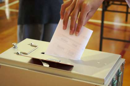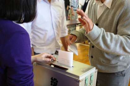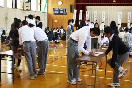 いよいよ投票が始まりました。選挙管理委員会から生徒一人ひとりに投票用紙が配られます。最もふさわしいと思う候補者と信任する候補者に○印をつけます。簡単に○をつける人もいれば、少し悩みながら記入する人もいました。みんな真剣な表情です。