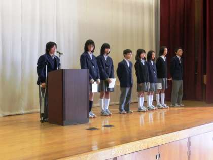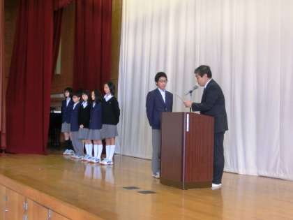 続いて学級委員の認証です。全学年の学級委員が起立する中、代表の3年2組の8名の学級委員に認証書が渡されました。